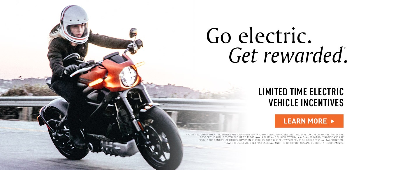 * Potential government incentives are identified for informational purposes only. Federal tax credit may be 10% of the cost of the qualified vehicle, up to $2,500. Availability and eligibility vary, may change without notice and are beyond the control of Harley-Davidson. Eligibility for tax incentives depends on your personal tax situation. Please consult your tax professional and the IRS for details and eligibility requirements.