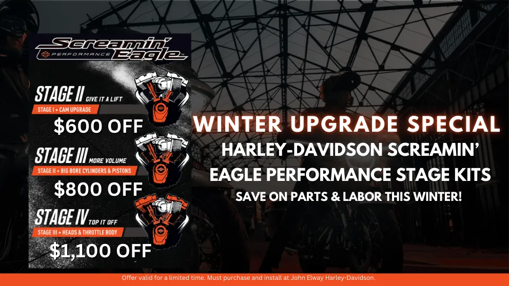 Take advantage of these exclusive winter savings at John Elway Harley-Davidson. All upgrades include parts and labor, and our team will handle the expert installation to ensure your Harley is tuned to perfection.